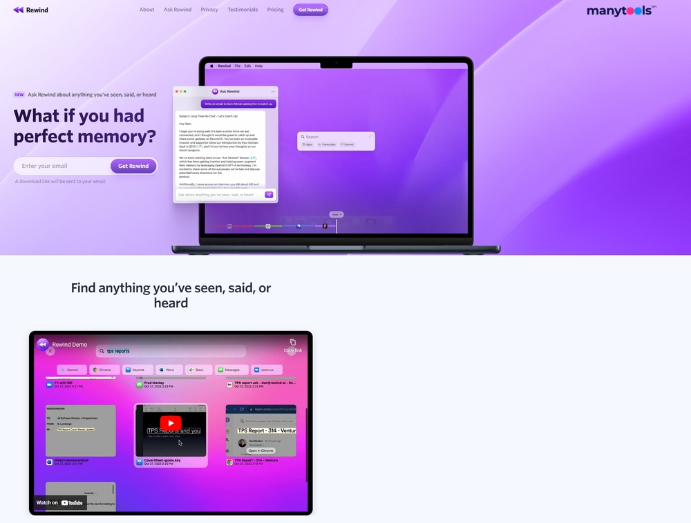 - Ask Rewind Chatbot: The $30 tier star, chat interface for queries like “summarize my Q3 calls” or “what was the competitor’s pricing?” It cites sources, generates emails, or brainstorms from your history. Futurepedia folks love the personalization: “Feels like it’s reading my mind, not my files.”