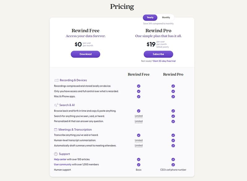 But oof, the rough edges bite. Mac-only (Windows beta’s “coming soon” since forever), so cross-platform dreams? Nah. Resource hog on older machines, fans spin like a jet on my 2020 model, per Medium gripes. Exports are clunky (manual per-day grabs), and Reddit’s brutal: A 2025 pre-order vet fumed, “Promised forever access for $100, got a sub model and basic app, might return it.” Accuracy dips on noisy audio or fast scrolls, and no mobile app means desktop tethering. Vs. Otter (meeting-focused, $10 start) or Mem (note-centric, broader integrations), Rewind’s niche but intense, great for visual recall, meh for collab.