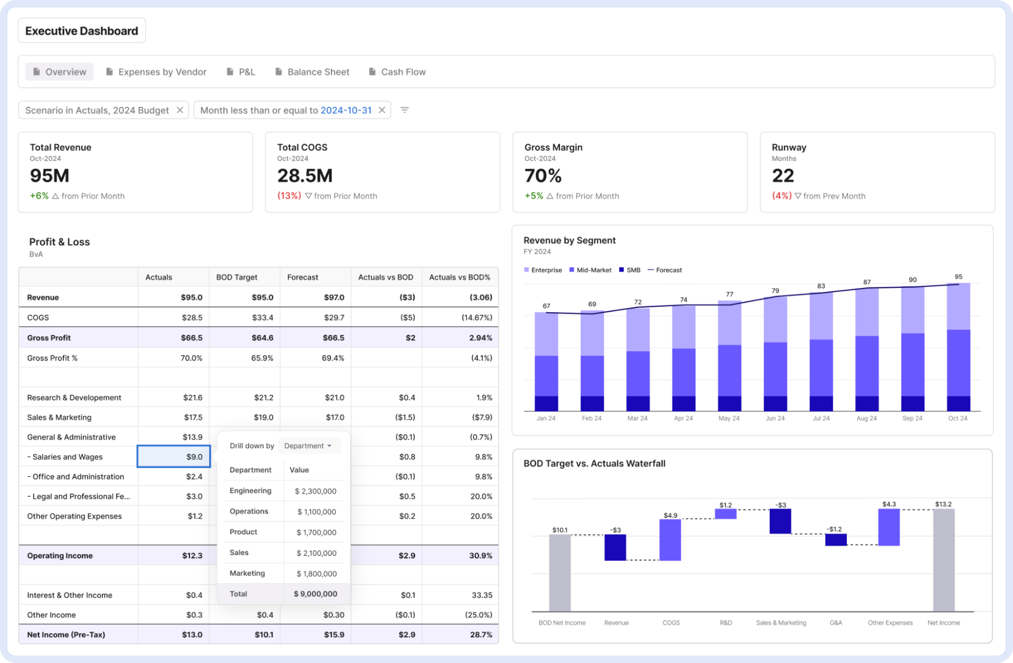 - AI-Driven Insights: Auto-generates narratives, variance reports, headcount plans. Ask in natural language (“Why did G&A spike?”), get breakdowns with charts. Users rave about this slashing manual analysis by 50-70%.
