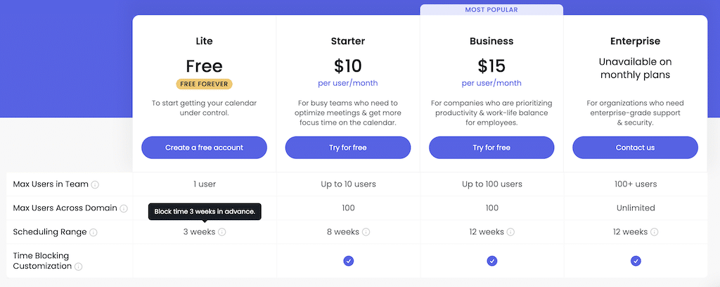 - Starter: $10/mo, Multi-cal, integrations, advanced.