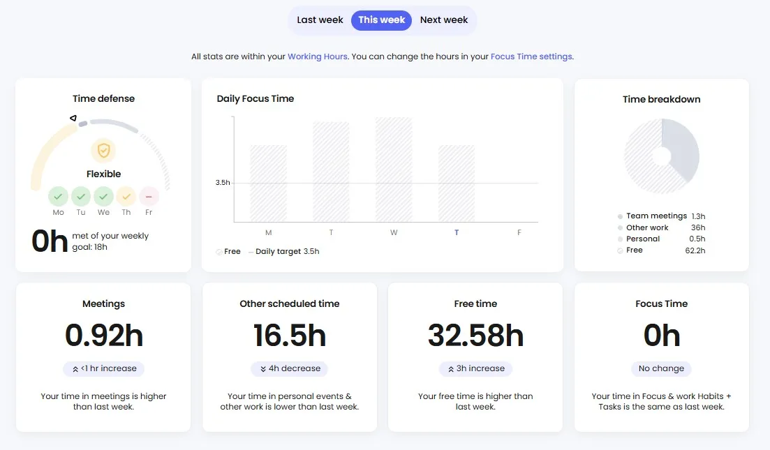 Perfect for knowledge workers craving focus (writers, devs, PMs), managers enforcing boundaries, remote folks fighting zoom fatigue. Teams love aggregated insights for burnout watch. Skip for rigid schedulers or basic blockers, native calendar suffices.
