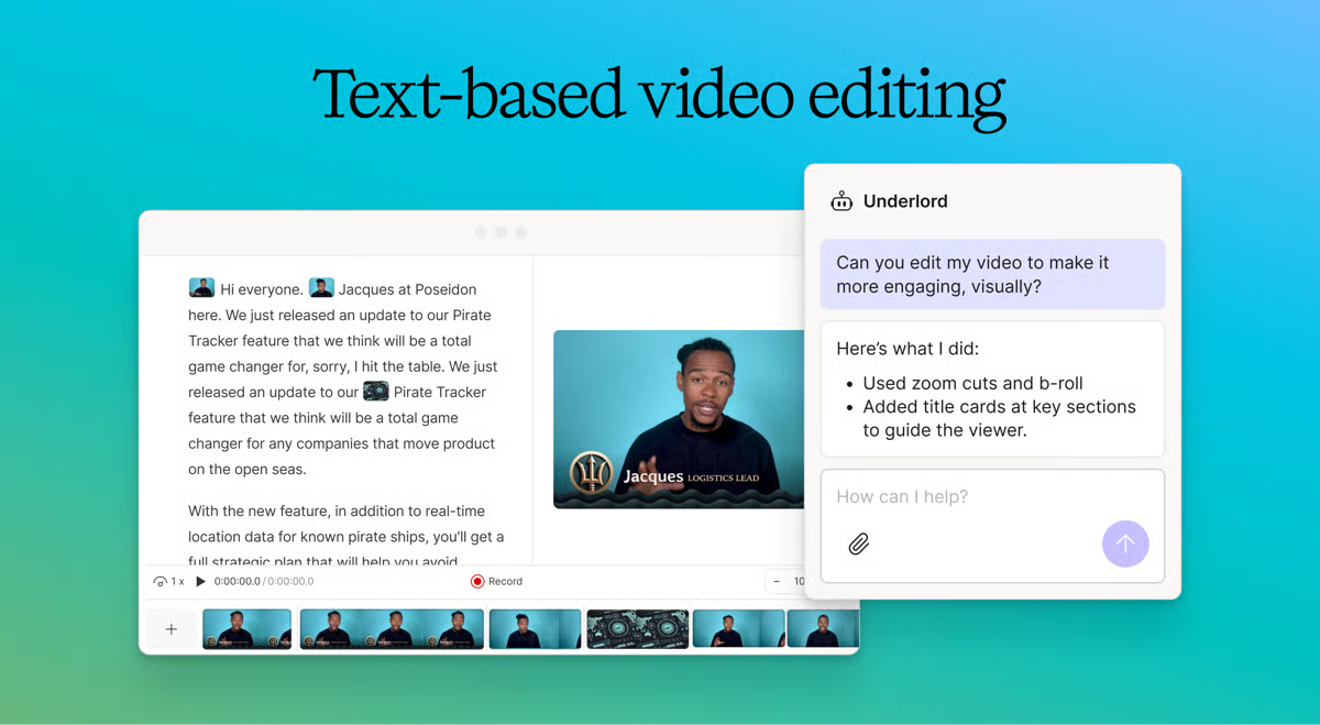 - Underlord AI Helper: Newish co-pilot, ask it to “shorten this intro” or “add b-roll suggestions,” and it does the grunt work.