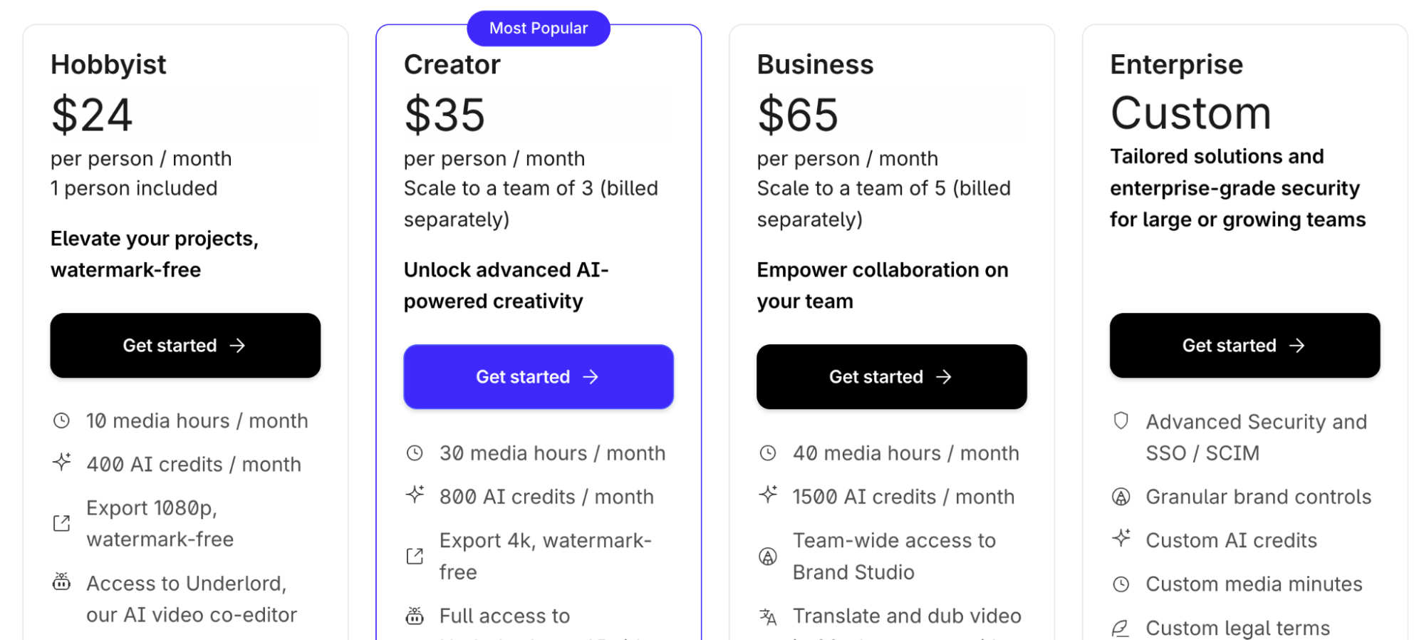 - Creator: $35/month, 30 hours, HD exports, Overdub.