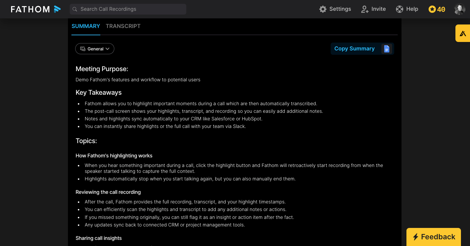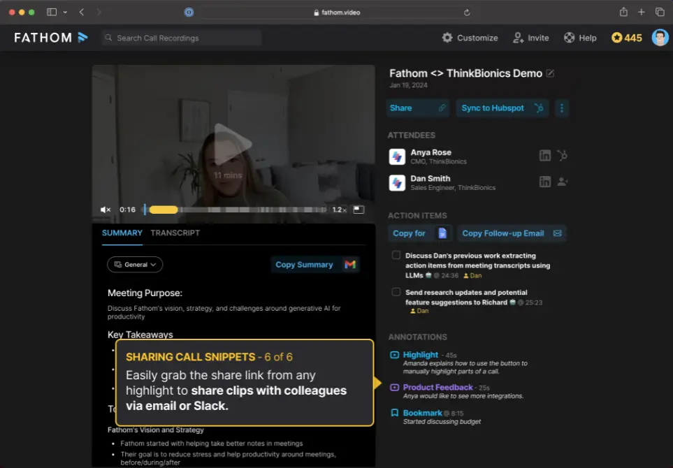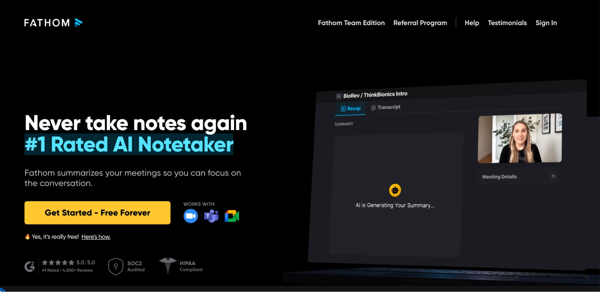 Launched back in 2020 by a crew tired of the same old grind, Fathom hooks into Zoom, Google Meet, and Microsoft Teams like it was born there. No clunky setups or endless tutorials, just a lightweight bot that joins your call (yeah, it’s visible, more on that later), captures everything in real-time, and spits out searchable transcripts, highlight reels, and AI-digested summaries. The magic? It pulls out action items, key questions, and even sentiment vibes without you lifting a finger. For busy pros like customer success reps tracking client vibes or salespeople chasing deals, it’s like handing over the tedious bits so you can focus on the human stuff, the laughs, the breakthroughs, the “aha” moments that actually move the needle.